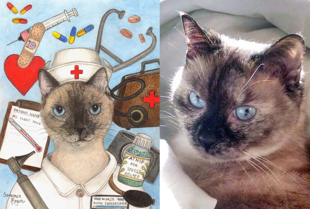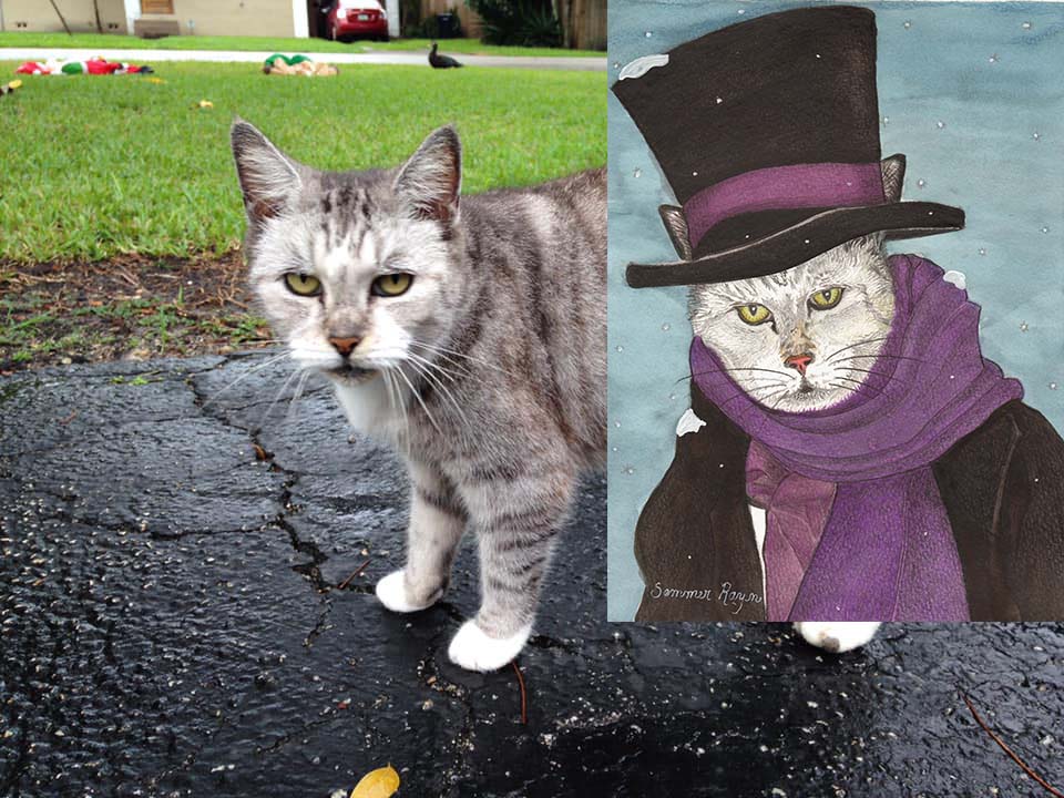Sometimes I am drawn to create a portrait of people’s pets. It’s fun to see where my vision of their pets takes me. For example, a winter hat in the snow or perhaps dressed up like the main character of Breakfast at Tiffany’s.