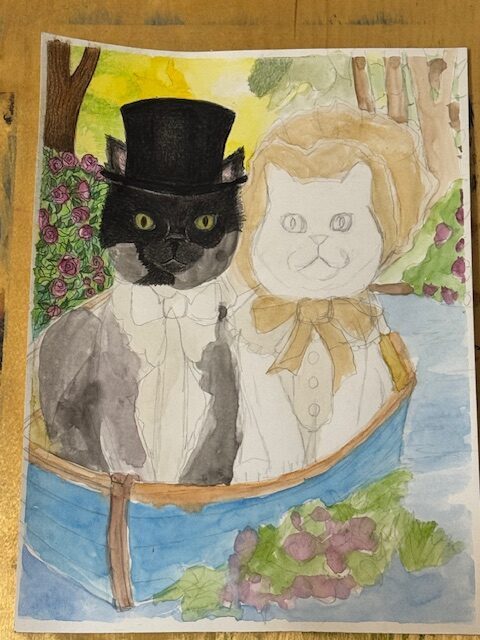 This is my current project. It is going to be a cute boy and girl cat, dressed in some vintage clothing, on a boat enjoying a peaceful day. It looks rough right now, but as I continue to work on it, the characters will come to life!